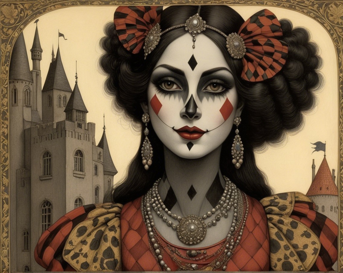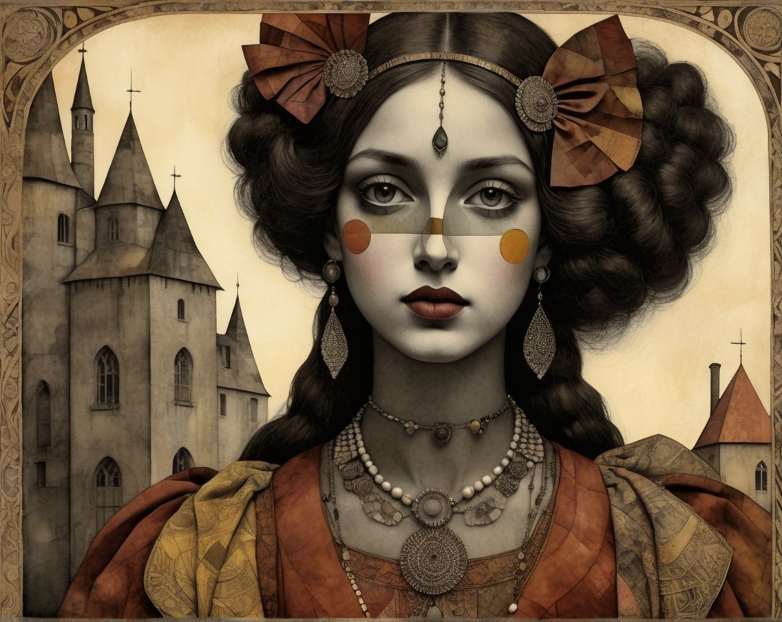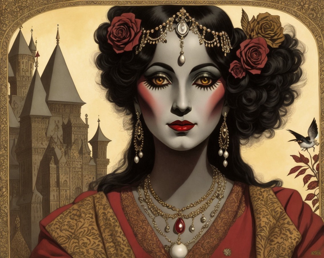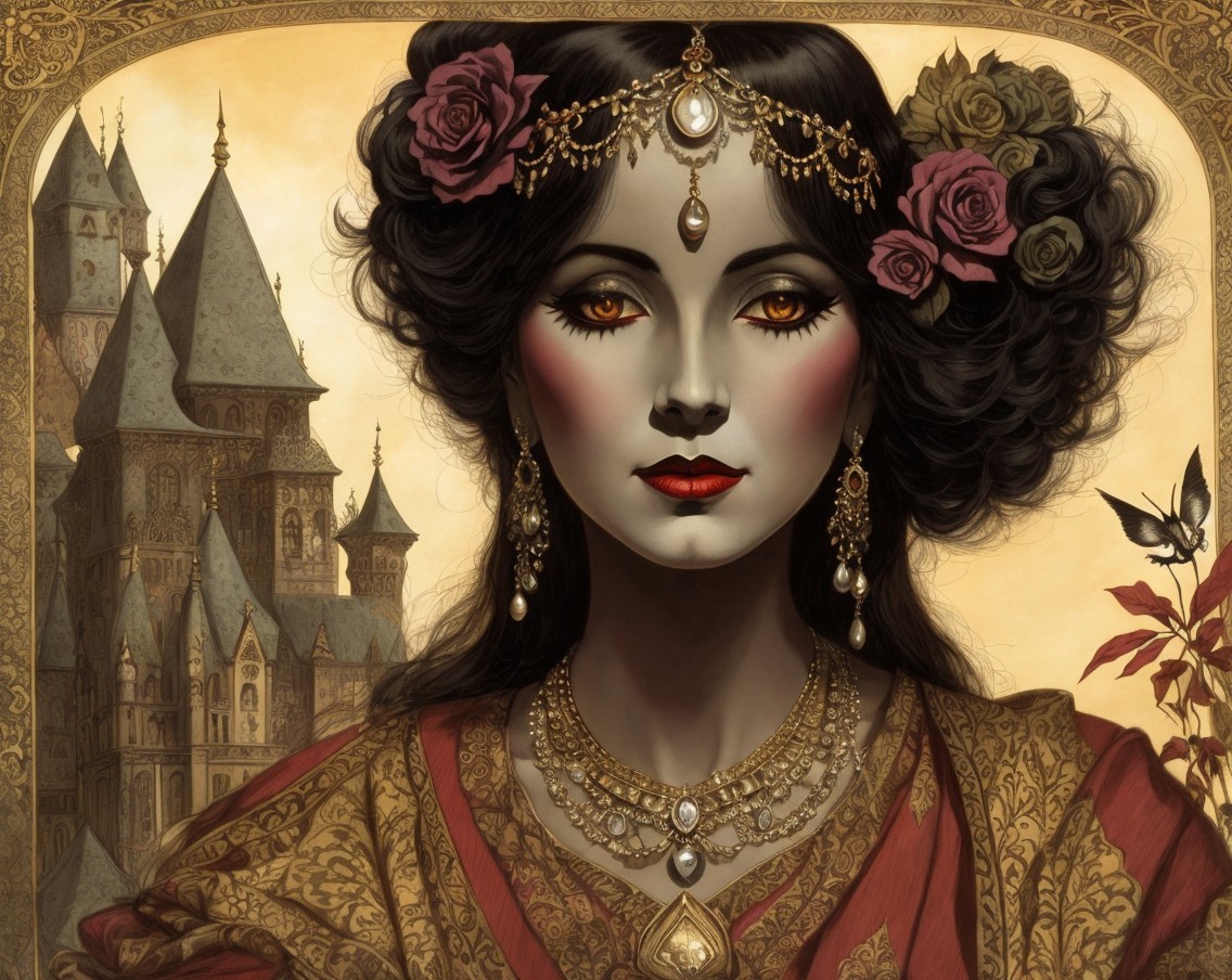 A woman in a vintage-inspired outfit stands with a serene expression. She has elaborate dark hair adorned with autumn leaves and butterflies, set against a backdrop of medieval-style architecture.