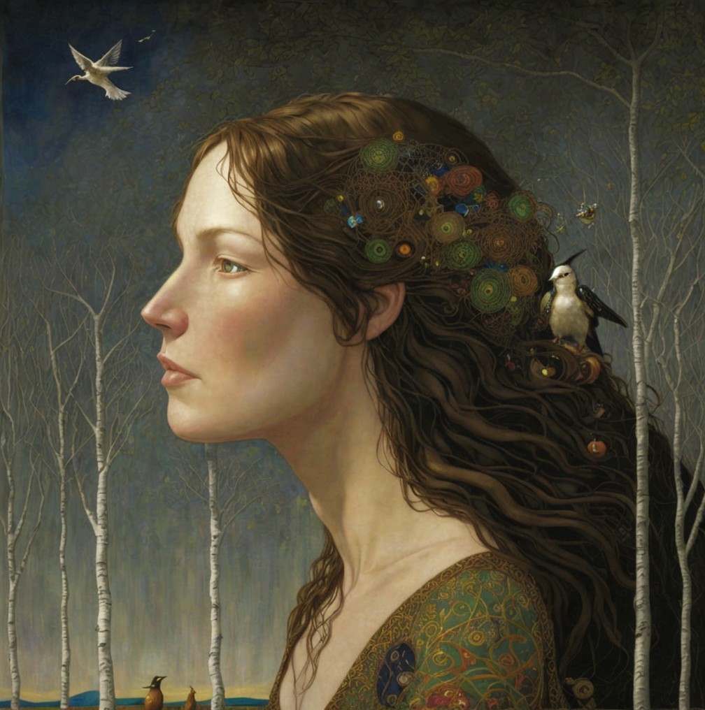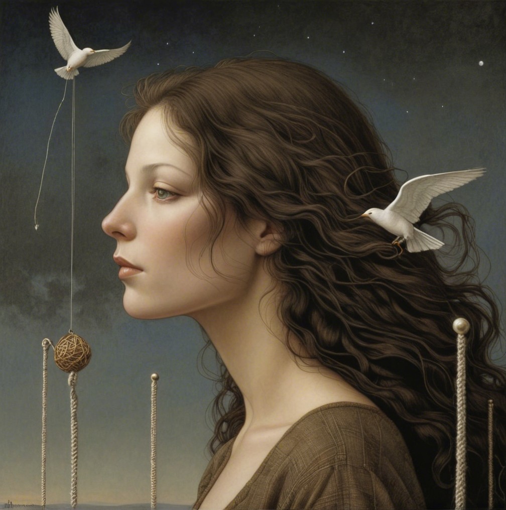+ Prompt:Charms, spells, priestess, magic. I haven't lived life, I haven't lived love. Just bird's eye view from the sky above". Love is a fragile thread, woven through moments. This artwork amalgamates the artistic styles of Michael Parkes,