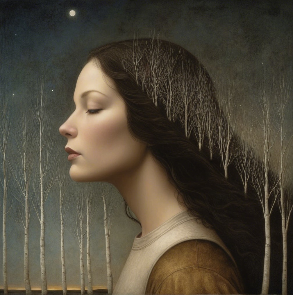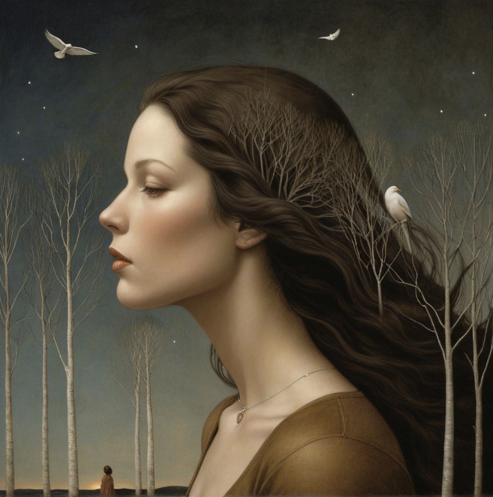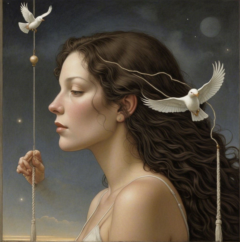 A serene portrait of a woman with flowing dark hair, gazing thoughtfully. Two white doves fly near her, and a golden sphere hangs delicately, set against a moody sky.