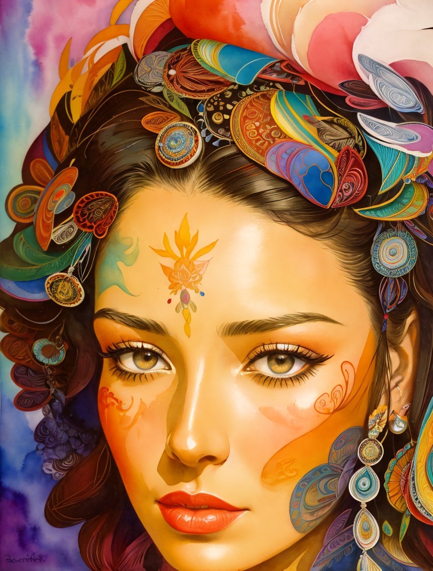 woodblick print, beautiful female shaman, headshot portrait, fine lineage and strokes by Florianne Becker and Georgia O'Keeffe, hues, translucent desaturated colors, Watercolor and ink Portraiture, quilling, glossy cuts, delicate hairstyle in stacked lines, shiny, glossy, close-up portrait, wavy --ar 4:5 --style raw, rough gritty texture, abstract, fauvism, realismo mágico, 3 layers in logarithmic distance with DOF, dark background, high-contrast features: gradient inking, pointillism details, great depth and scale, crisp realism, precision, expansive decadence , harsh light, textured pointillism, graphically diverse textures, architecturally detailed, multidimensional complexion, brown hair, striking tribal details, bold auburn lips,1960s advertising style with minimalist influence, radiance, highly detailed strokes, octane render illustration, luminosity 1.4, stylized headshot in beige and sepia tones, rim lighting, style By susan Seddon Boulet, Margaret Keane, american gothic 1.7, concept art, triadic color scheme beige teal grey, high coloring 1.9 ,meticulously, stylized close-up portrait, stylized face, Anglo gothic 1.9, auracore, high coloring 1.9, watery alcoholic painture, soft rounded edges, chiaroscuro lighting, ambient occlusion 1.5,, 3d effects 1.8, intricate stylized hairstyle, brightness 1.7, ((background stylized zentangle lines, radiance, brightness 1.4, silver particles, dreamy glow, Stylized background, woodblock print, fine hair lineage and strokes by Florianne Becker and Georgia O'Keeffe), tints of abstract art nouveau illustration, sepia gradient colours, tints of timlin, 8:5), 3d effects 1.8, shadow mapping 1.3, dynamic lighting 1.7, ambient occlusion 1.5, anisotropic filtering 1.9, ethereal, abstract, earth tones, symmetrical face, Subdued palette,