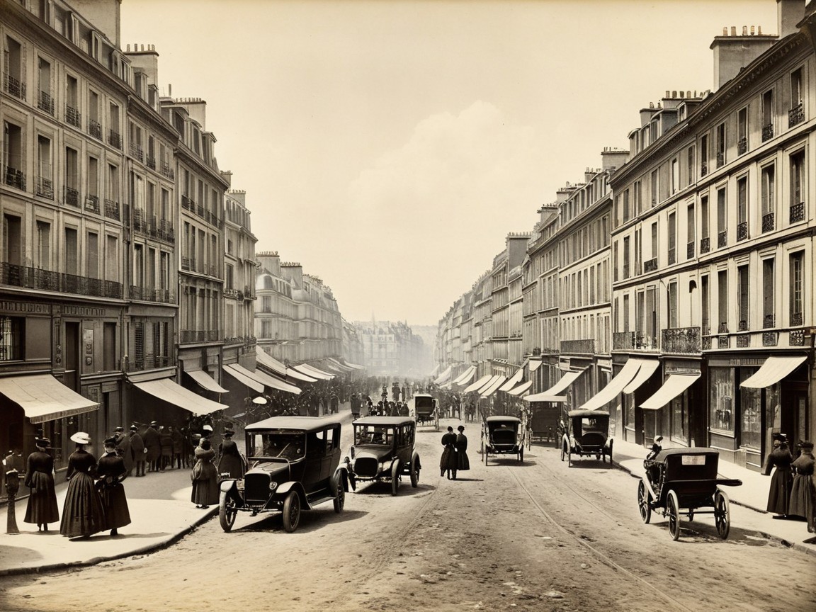 A bustling street scene from the early 20th century, featuring vintage cars and horse-drawn carriages. Elegant buildings line the road, with people in period clothing walking along the sidewalks.