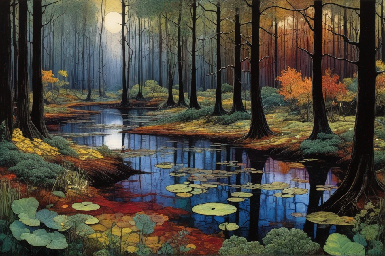A serene forest scene with a calm river, autumn leaves, and misty light filtering through tall trees.