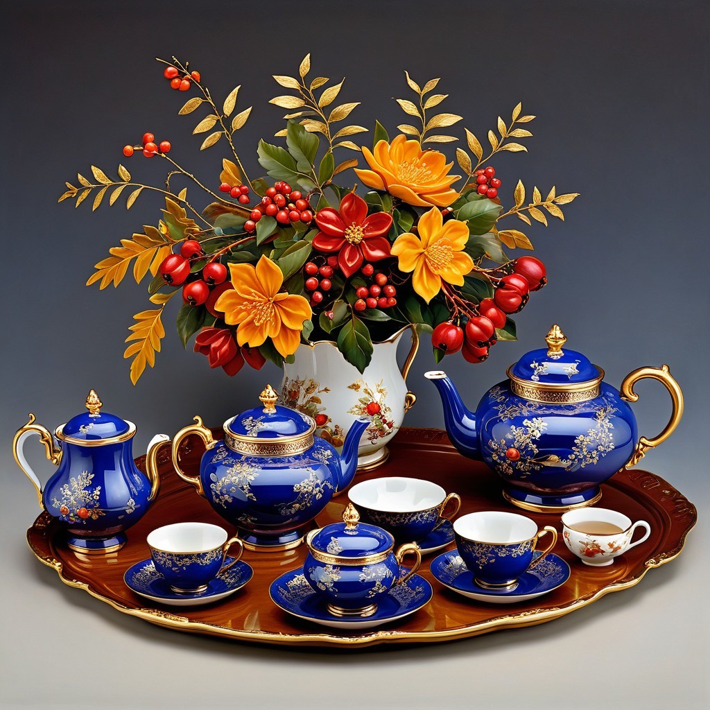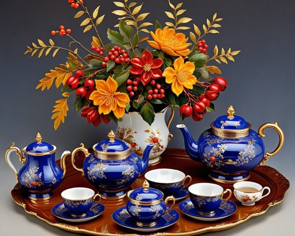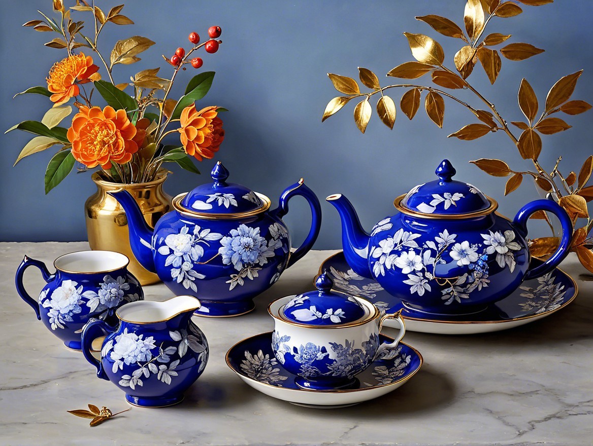 - The focal point is a beautiful, ornate **tea set of cobalt-blue porcelain**.