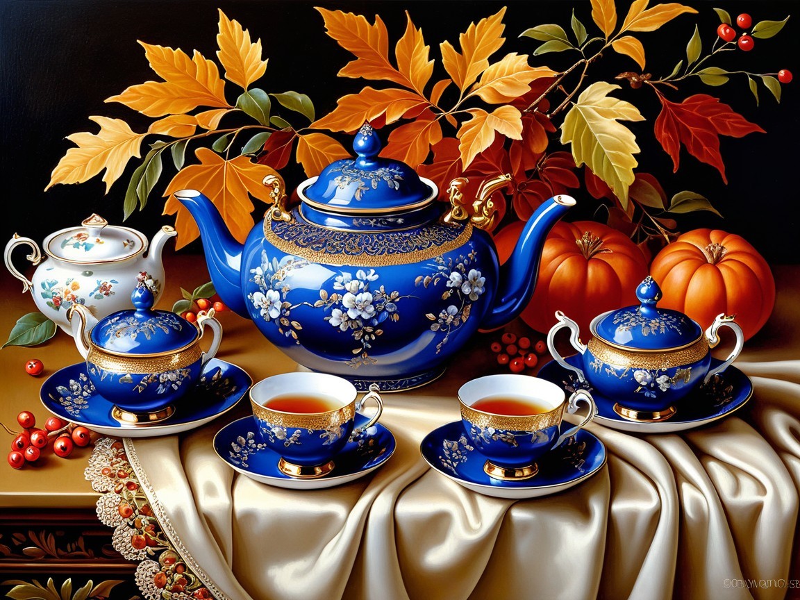 - The painting is painted in a rich, almost hyperrealistic style, combining realism with hints of romanticism. - Warm and inviting light creates a sense of peace and comfort—like sipping a cup of tea while watching the autumn leaves fall.