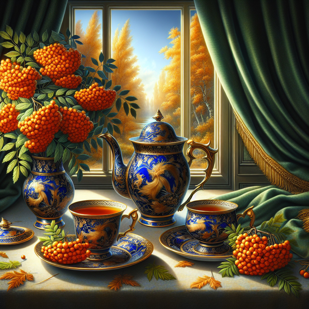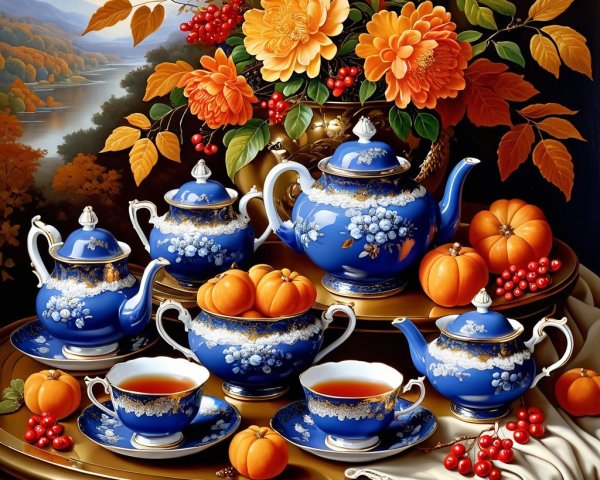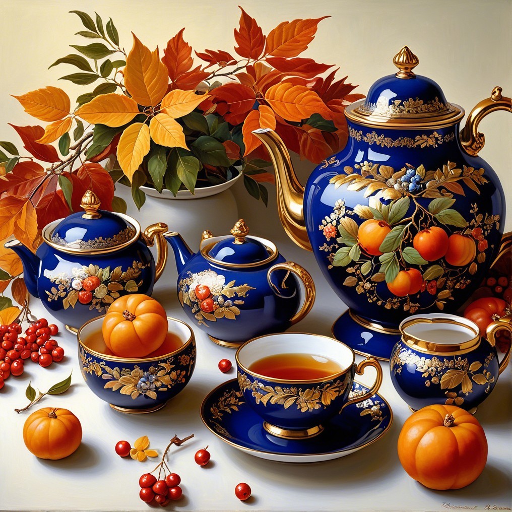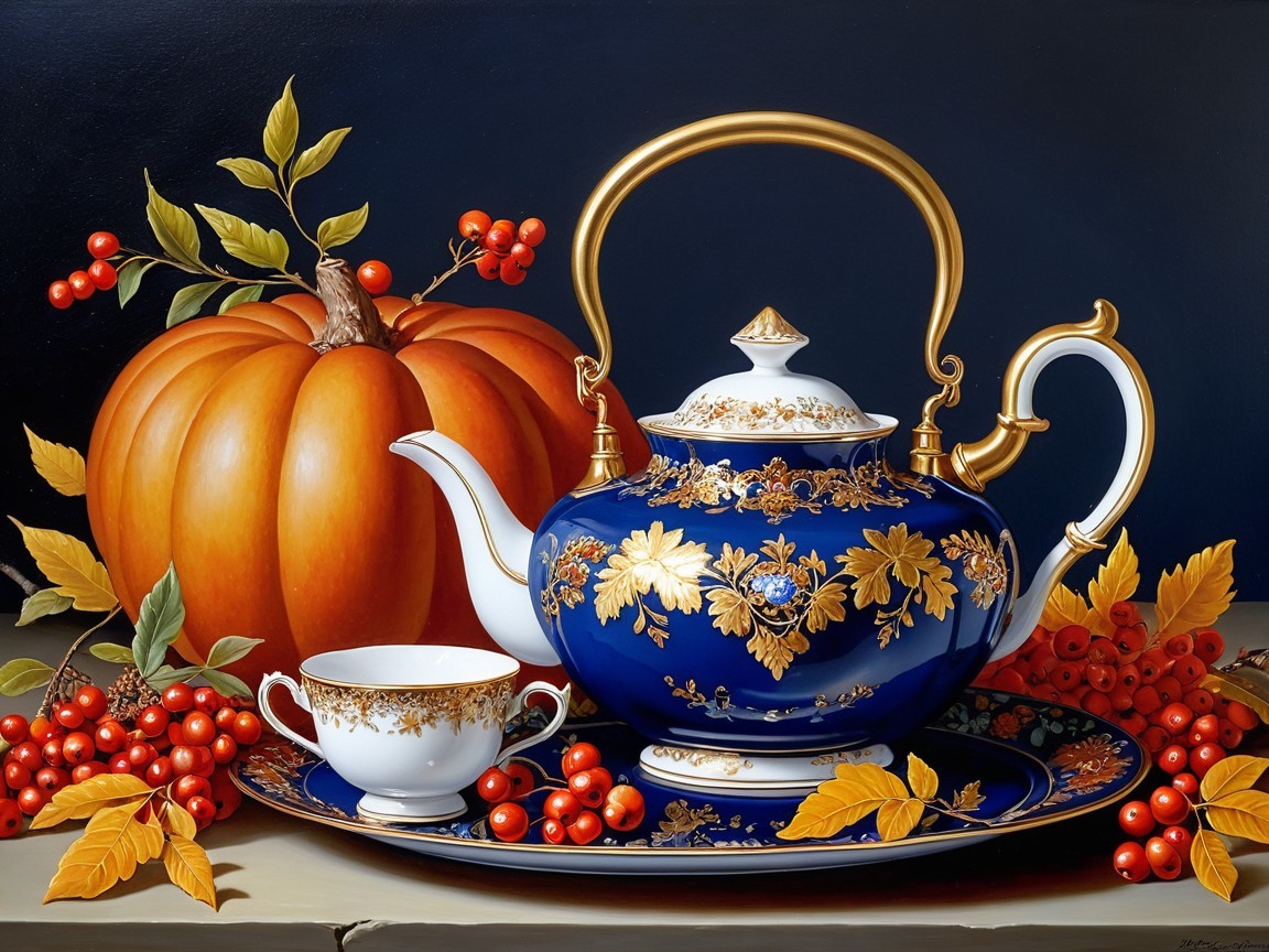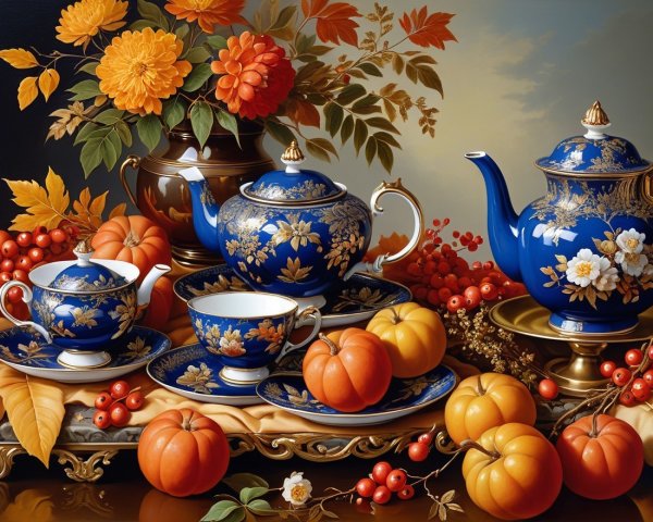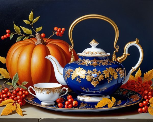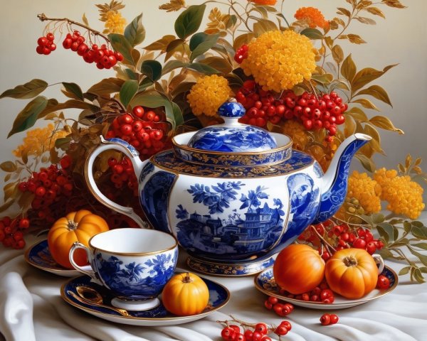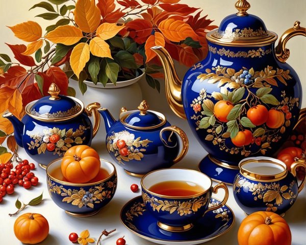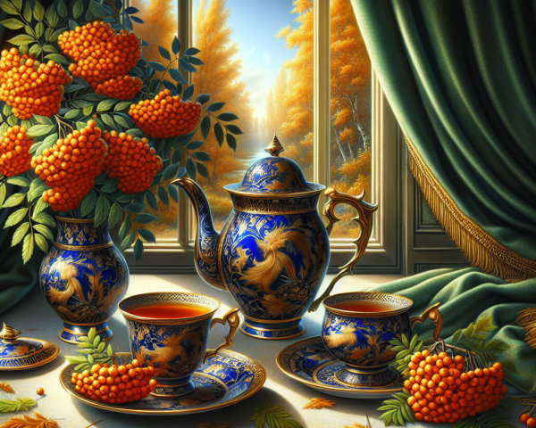 - It is decorated with intricate **gold leaf** and delicate **floral patterns**, possibly depicting rowan berries or other autumnal flowers, echoing the fruit in the scene.