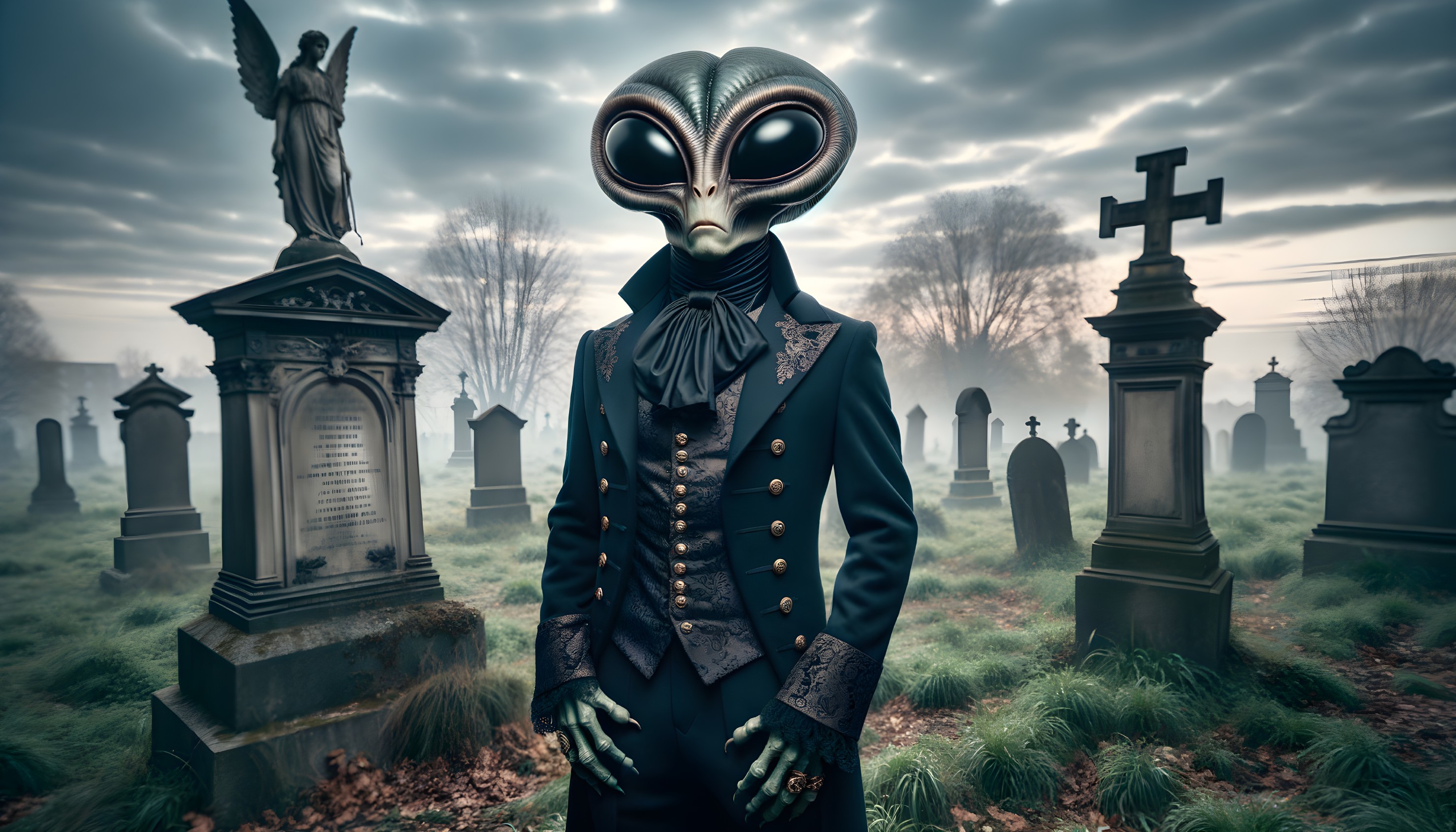 An alien with large eyes dressed in a vintage suit stands in a foggy graveyard with eerie statues and gravestones.