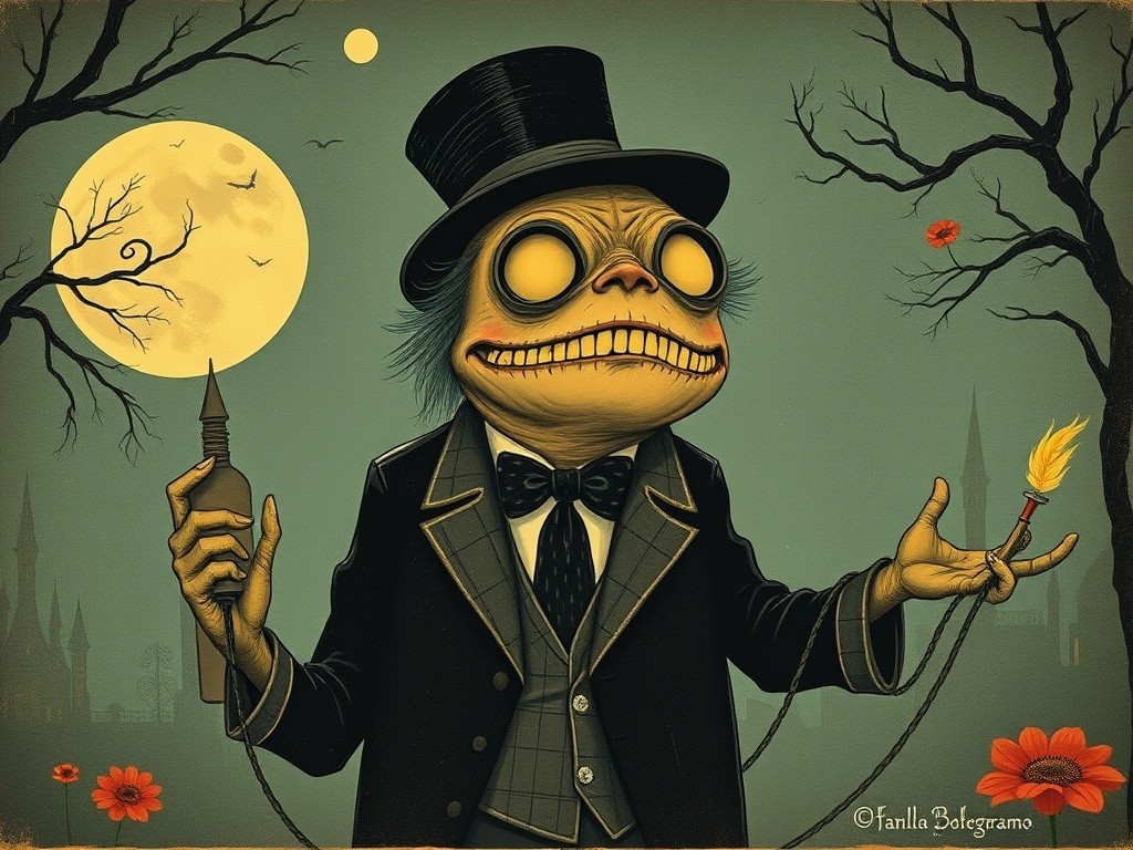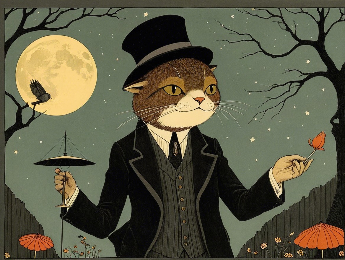 A stylized illustration of a woman with a bowler hat, surrounded by autumn leaves, birds, and a castle under a yellow moon.
