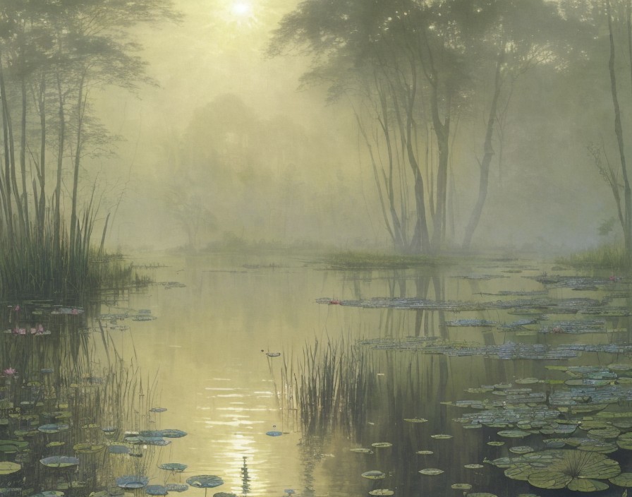 Prompt: River backwater, reed thicket, waterlilies on the water, mid-summer, noontime, the languor of a summer day, sun rays breaking through the light fog, wet brush effect, intricate, by John Atkinson Grimshaw, by Gerald Brom, by Ivan Bilibin