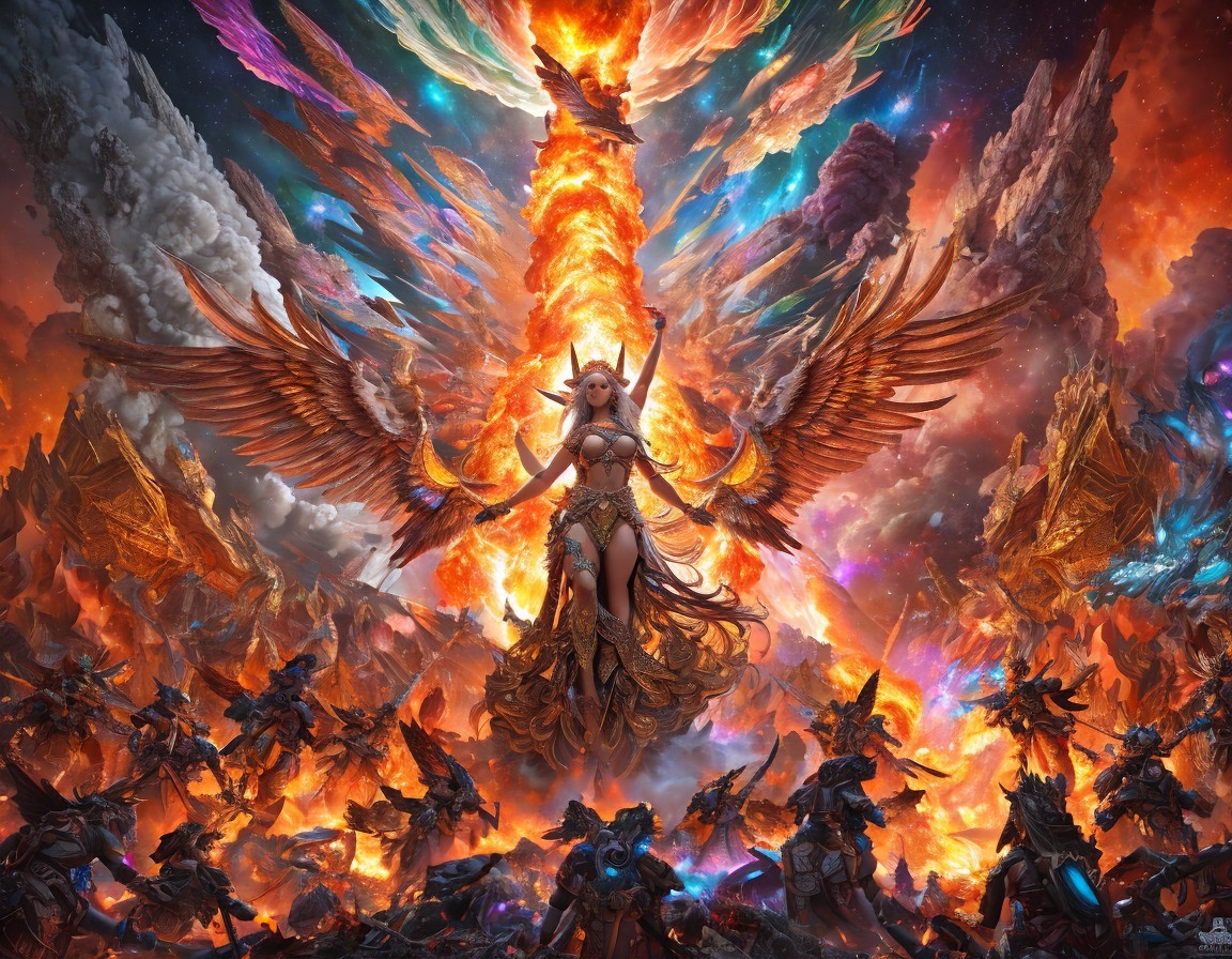 breathtaking illustration of An overwhelmingly chaotic scene of an erupting Godeather known as Eve, with the War Goddess, Eve-Angels and God-Creatures engaged in an intense battle for dominance. The background is a kaleidoscope of intertwining colors and abstract patterns, creating a mesmerizing visual spectacle that draws the viewer's eye to every corner of the image. The towering War Goddess, adorned in intricately designed armor that shifts and changes with her every movement, stands tall amidst the throng of deities and creatures, her maniacal grin etched onto her face. The foreground is dominated by the immense figure of the War Goddess, who towers over the other figures in the scene, her presence commanding attention and exuding an aura of unyielding determination. The MortalGun, ineffective against the God-Eathers, lies discarded at her feet, as if a mere afterthought in the face of the all-consuming chaos that rages around her. The air is thick with the energy of battle, with the sounds of clashing armor, deafening roars and otherworldly screams filling the void. The battlefield itself is a canvas of swirling colors, as the blood of slain creatures mingles with the ephemeral essence that coats the ground, further adding to the surreal and chaotic atmosphere. The intense struggle between the forces of order and chaos plays out before the viewer's eyes, each twist and turn of the fight revealing new alliances and betrayals, as the fate of the secret network hangs in the balance., (illustration:1.3), masterpiece, breathtaking illustration, sharp focus, depth of field, 8k photo, HDR, professional lighting, taken with Canon EOS R5, 75mm lens