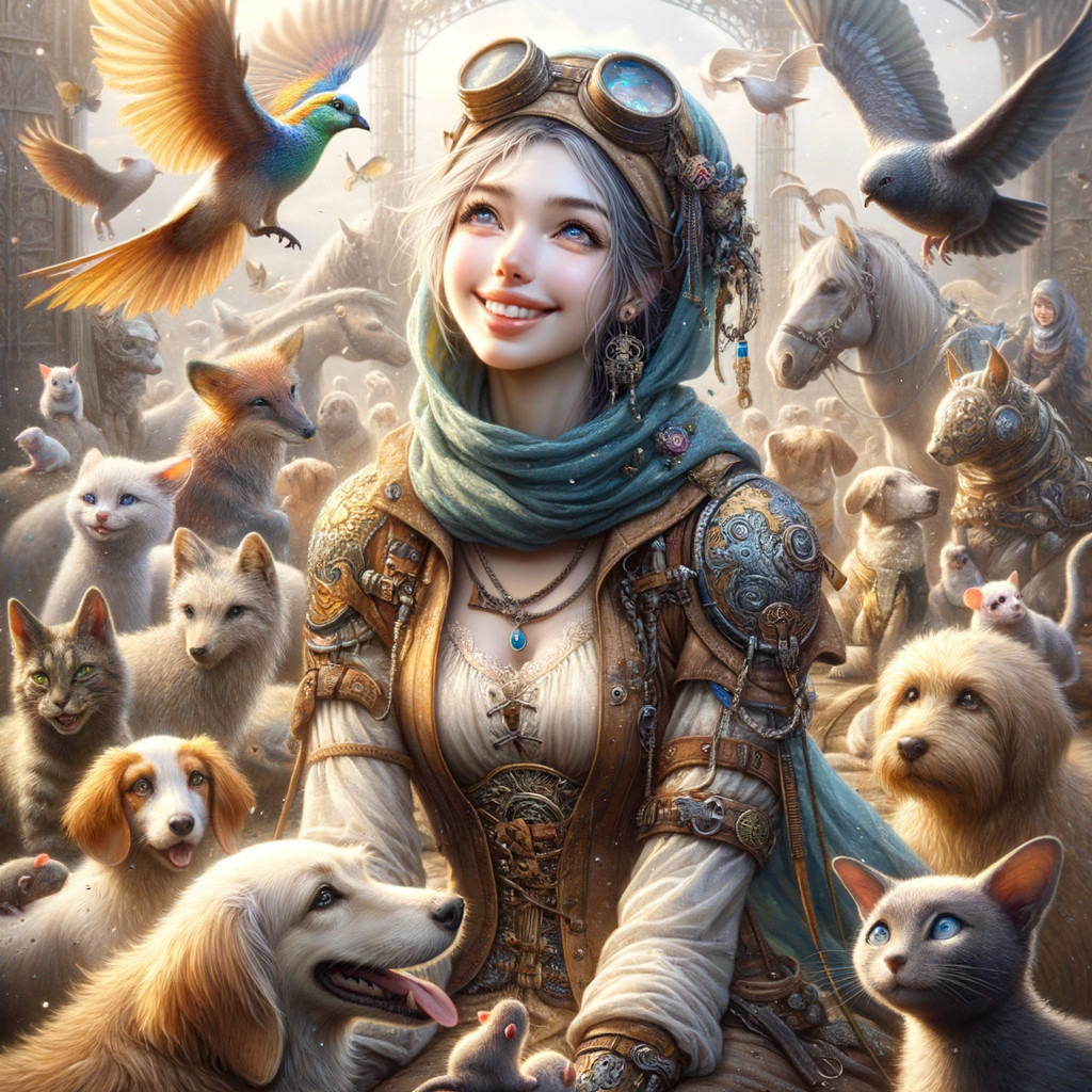 Prompt: "Happy Pet Sitter, in an intricate outfit with cats, dogs, horses, birds, wildlife surrounding her. Face pale, with kind blue eyes, grinning. Small & large pets dogs, cats, rats adorn her"