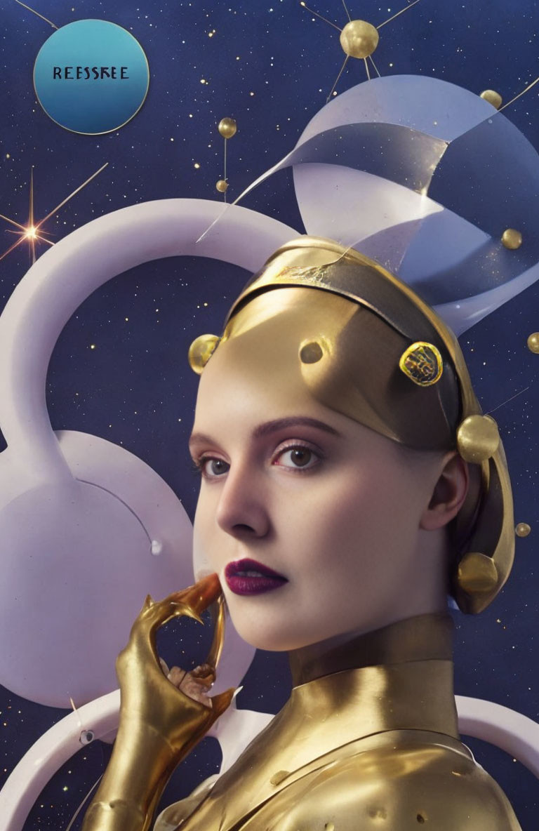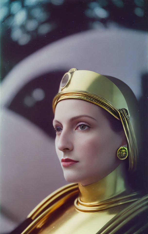 + Prompt:Autochrome photography, color photo, portait of a beautiful golden Female android made from brass metal and bakelite with a metal face with rivets in style of Art deco, art nouveau, space age, 1920s, 1930s, futuristic fashion, round shapes, round face, Fritz lang, metropolis, science fiction, vintage, large breasts, space station, bakelite, copper, strange planet, pre-war technology, brave new world, 1984 movie, dystopian, background space with stars and planets in the look of the 1930s