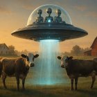 A serene rural landscape features two cows curiously watching a flying saucer above. The UFO beams down light, revealing extraterrestrial figures peering from its dome...