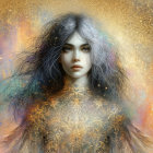 A figure with long, flowing gray hair stands against a radiant, golden background. Wearing an elegant, intricately buttoned garment, they exude a serene, ethereal aura.