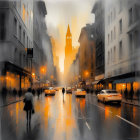 A desolate, post-apocalyptic urban landscape features towering, crumbling buildings, dark skies, and puddles reflecting dim streetlights, evoking a sense of abandonment and eerie stillness.