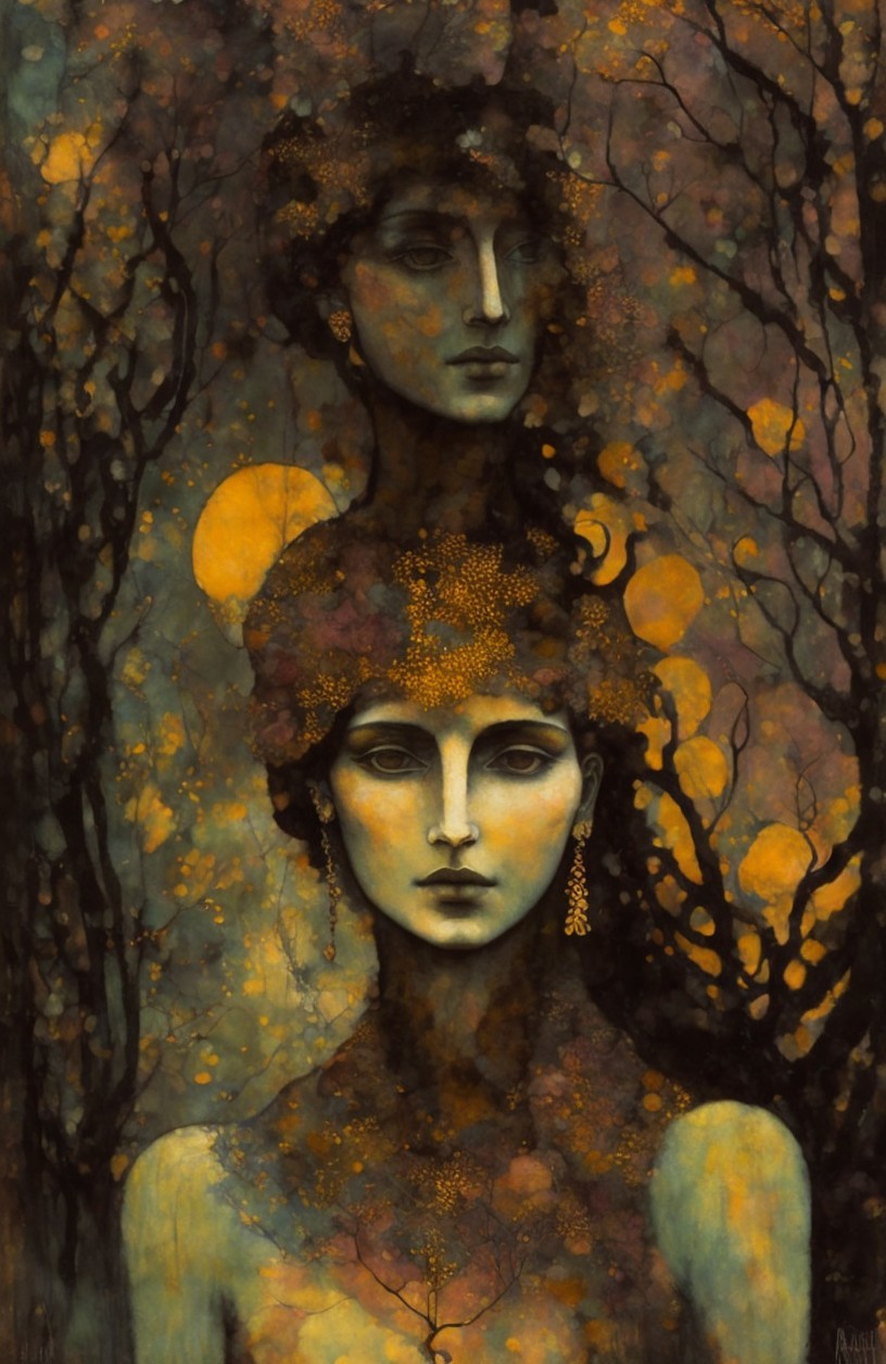 Beautiful woman, portrait in ochre, patina of ancient stone with moss, art brut, moody, somber, desaturated colors, in the style of Paul Klee, Arthur Rackham