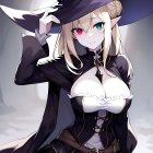 A stylish character with long blonde hair, wearing a wide-brimmed black hat and an elegant dark dress with lace details, stands on a charming street, exuding confidence and charm.