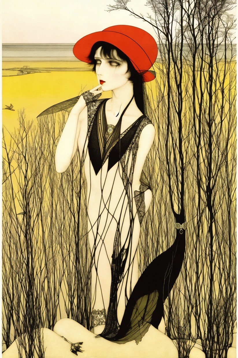 An illustration of a pale woman in a black dress and red hat standing among stylized black trees on a yellow background.