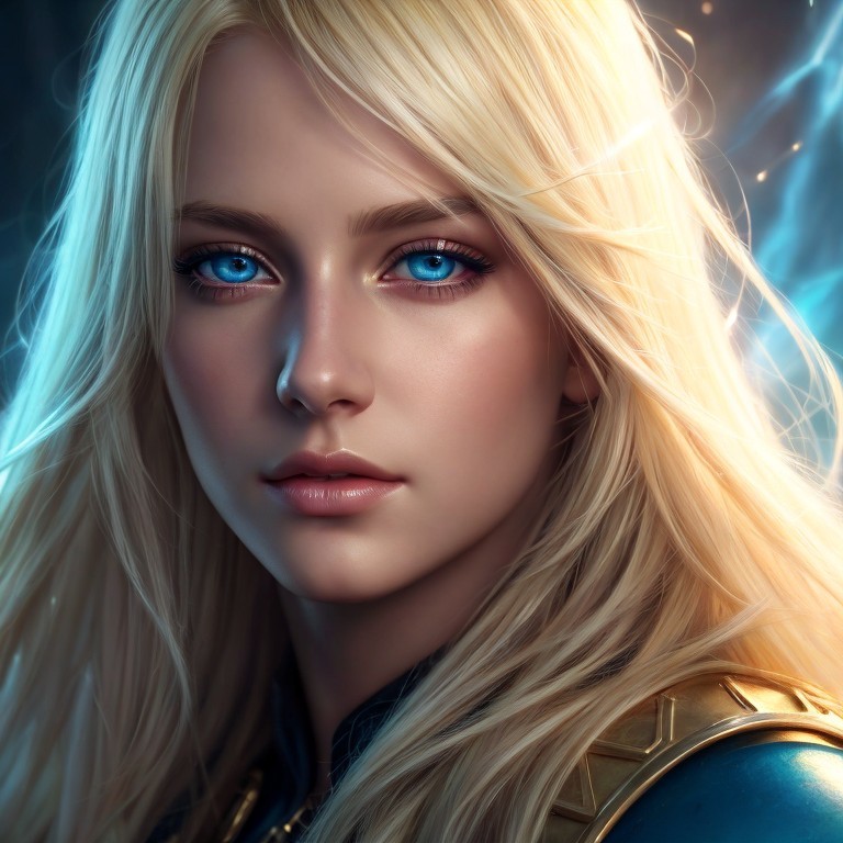 A digital portrait of an animated woman with striking blue eyes, blonde hair, and a hint of armor, set against a dynamic, glowing backdrop.