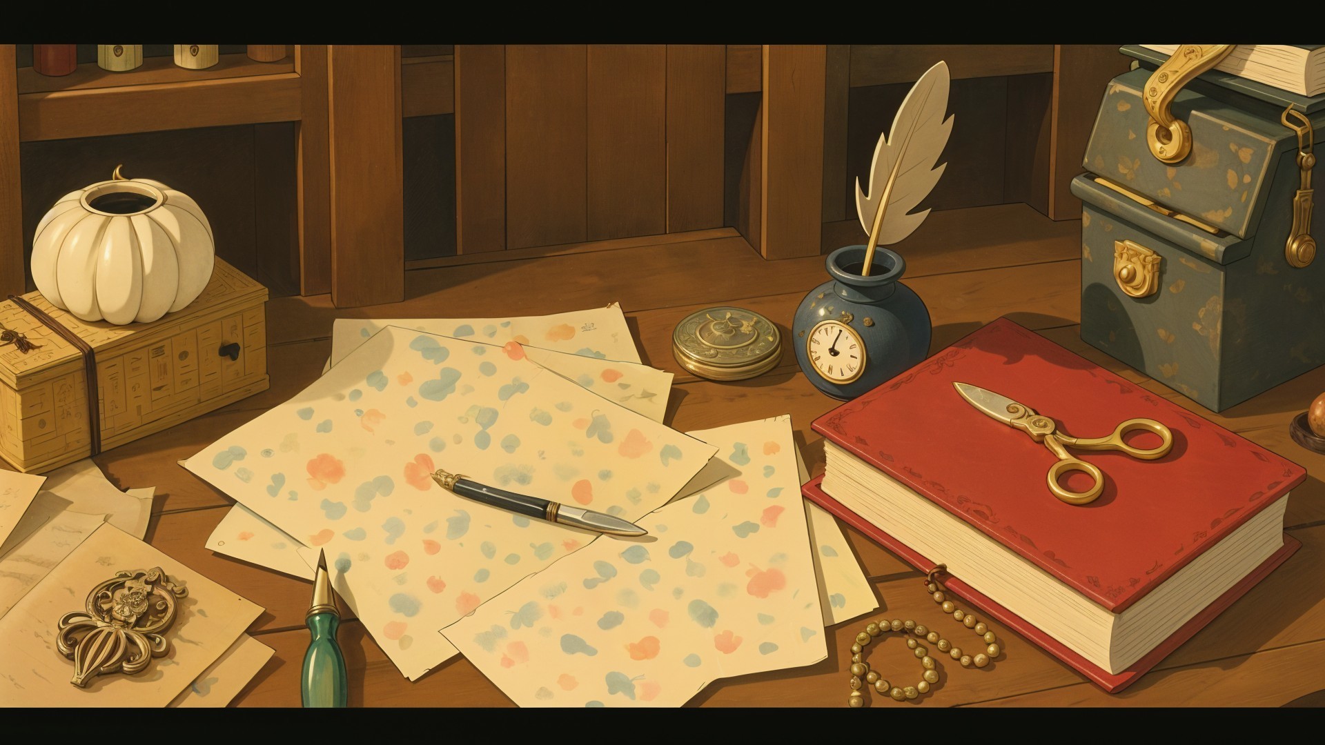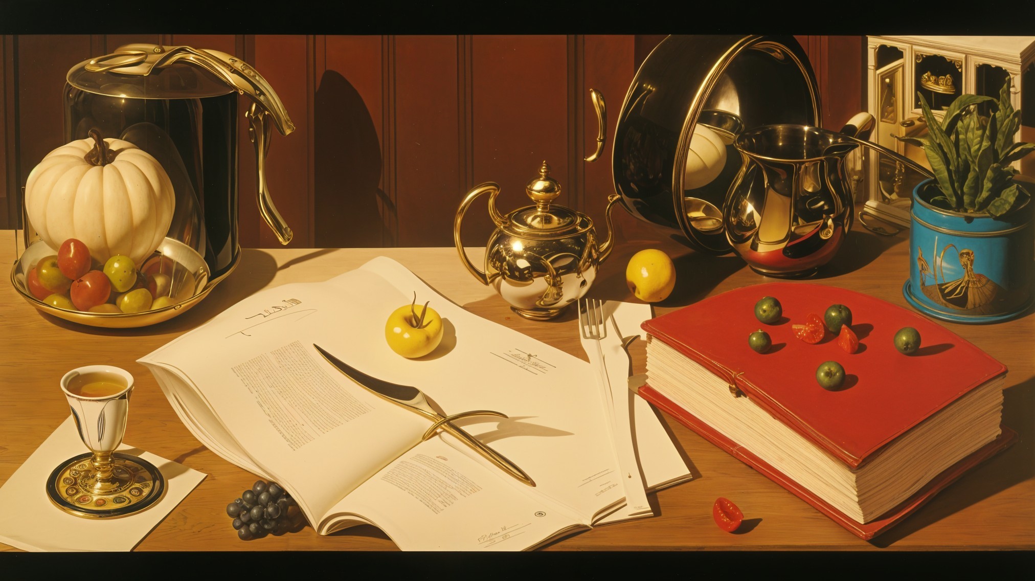 A still life composition featuring shiny metallic objects, including teapots and a cloche, alongside vibrant fruits and open books, creating a rich and elegantly arranged tableau.