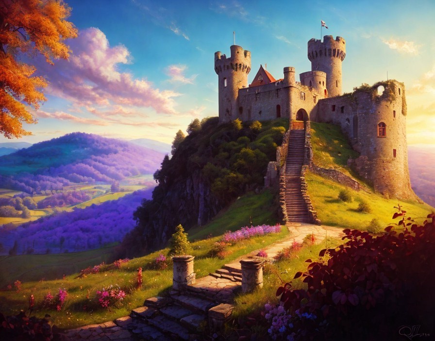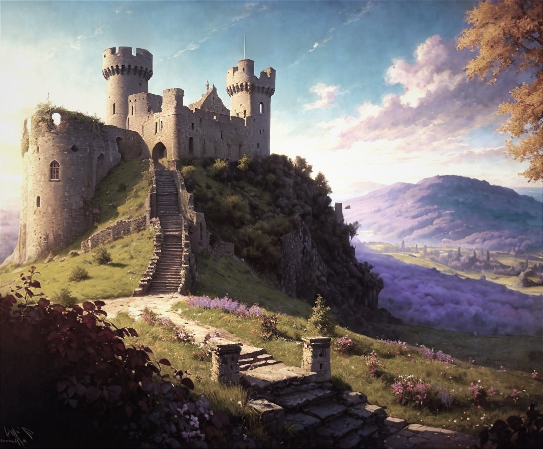 An ancient stone castle perched on a lush hilltop with sprawling stairs, surrounded by vibrant flora under a soft, cloudy sky.