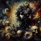 A surreal portrait of a woman with flowing black hair adorned with colorful flowers, surrounded by vibrant swirling colors and shimmering orbs, creating a mesmerizing and dreamy atmosphere.