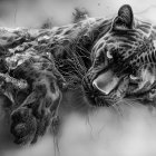 A stunning black and white illustration of a leopard lounging. Its detailed fur and intense gaze are surrounded by flowing, decorative elements that enhance its majestic presence.