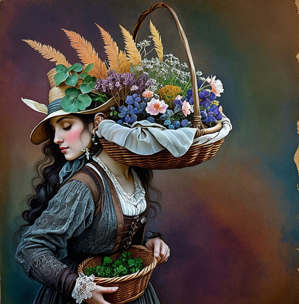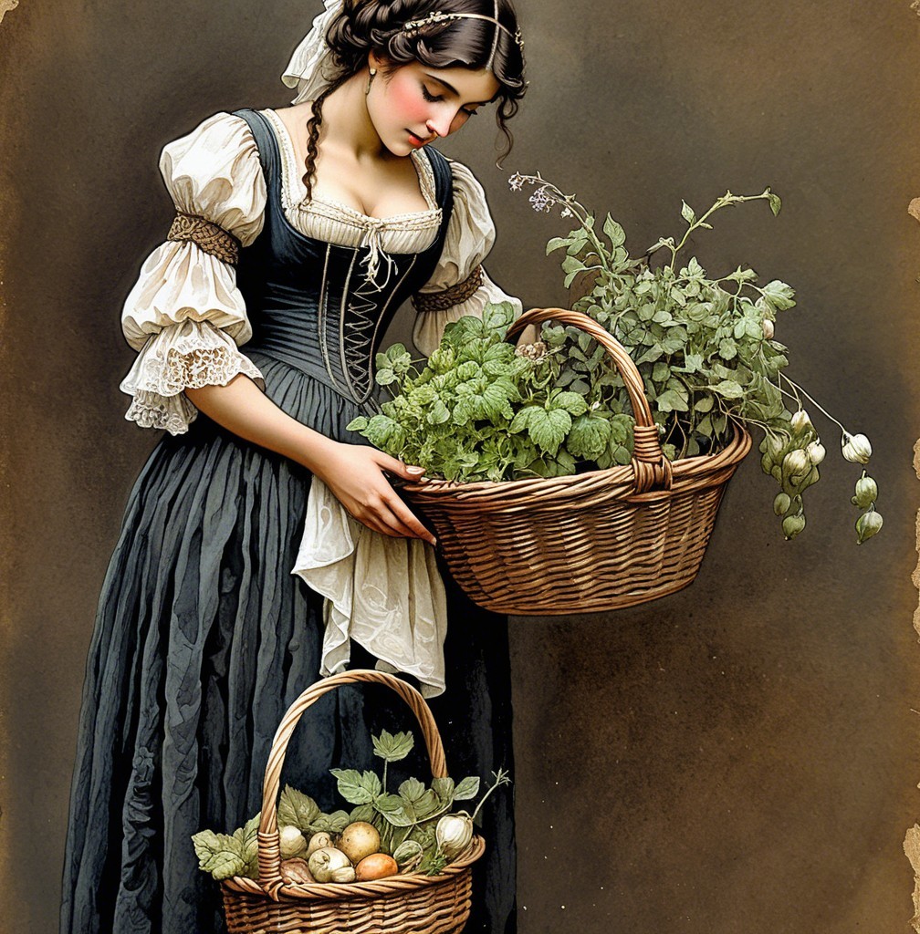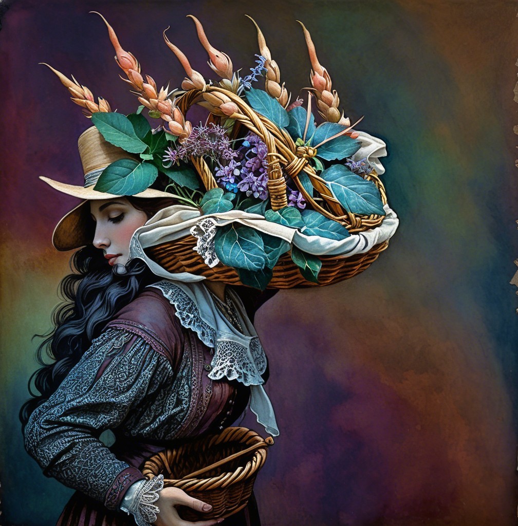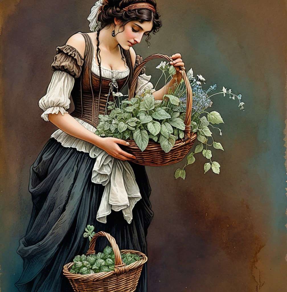 . Gypsy lady collecting herbs in basket , colored ink drawing, watercolor artwork on old withered paper, vintage, by Caravaggio, Fragonard, Anton Pieck, pale colors, high detail, intricately detailed, hyperdetailed volumetric lighting, art nouveau graphic steampunk ., whimsical, beautiful, poignant, touching. colors blush bronze, black. soft watercolor extra water in magical realism by Annigoni, Egon Schiele, Milo Manara, Botticelli, Catrin Welz-Stein, Jean Metzinger, Klimt, perfect eyes, perfect handsface, highly detailed, complementary colors, hyper detailed. Watercolor and ink splatter, dynamic pose, dark blue background, unreal engine, alphonse mucha, global illumination, detailed and intricate environment Beautiful woman in the style of Pino Daeni Dorota Piotrowiak Edward Gorey, junji ito, klimnt , gold leaf color, silver leaf color beautiful dynamic lighting high definition hdr * Random prompt award winning Max Ernst ultra detailed 4K 3D Texture