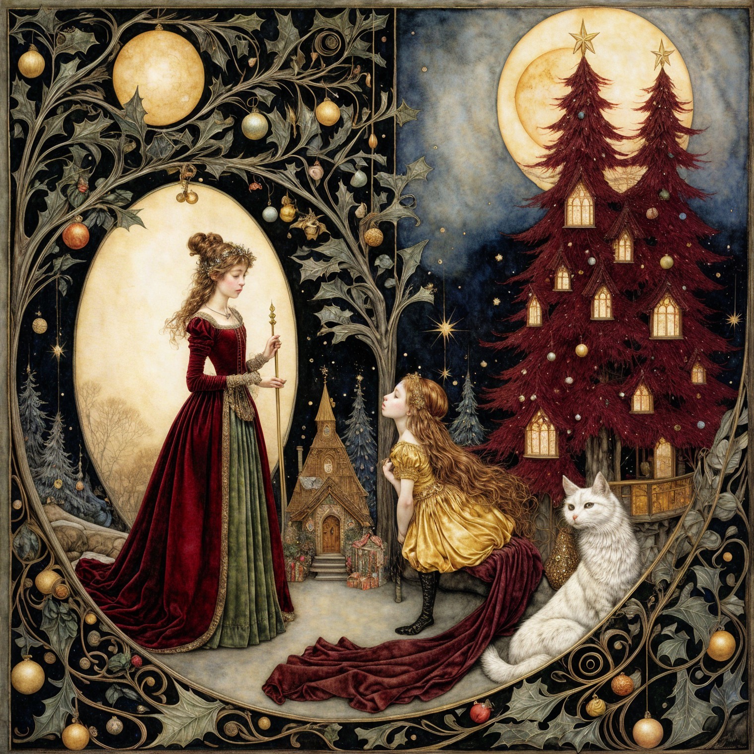 In a whimsical winter scene, two elegant women in historical attire are surrounded by festive decorations. One holds a candle, while the other inscribes in a book, under a full moon.