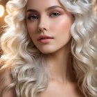 A stunning woman with long, wavy platinum blonde hair adorned with a decorative steampunk accessory. She gazes intently at the camera, set against a beautiful sunset by the sea.