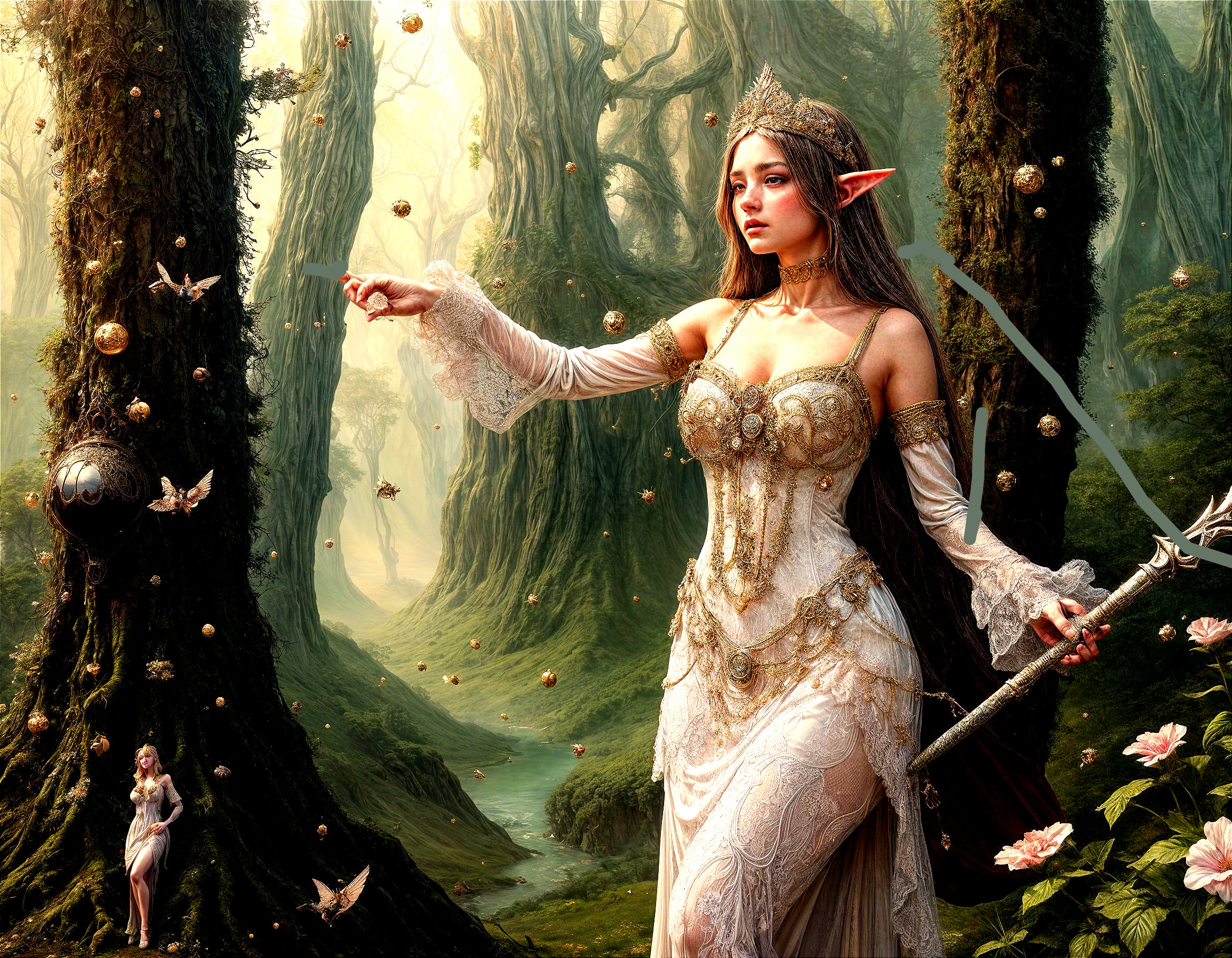 This artwork features a stunning medieval fantasy scene with elves and ents battling amidst a paradise filled with monsters. The composition showcases intricate details, vibrant colors, and cinematic lighting, creating a surreal atmosphere.