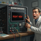 In a lab, a panicked scientist reacts to a machine labeled "TIME OF DEATH DETECTOR," which displays "RIGHT NOW." Beakers and colorful liquids surround him, adding to the tense atmosphere.