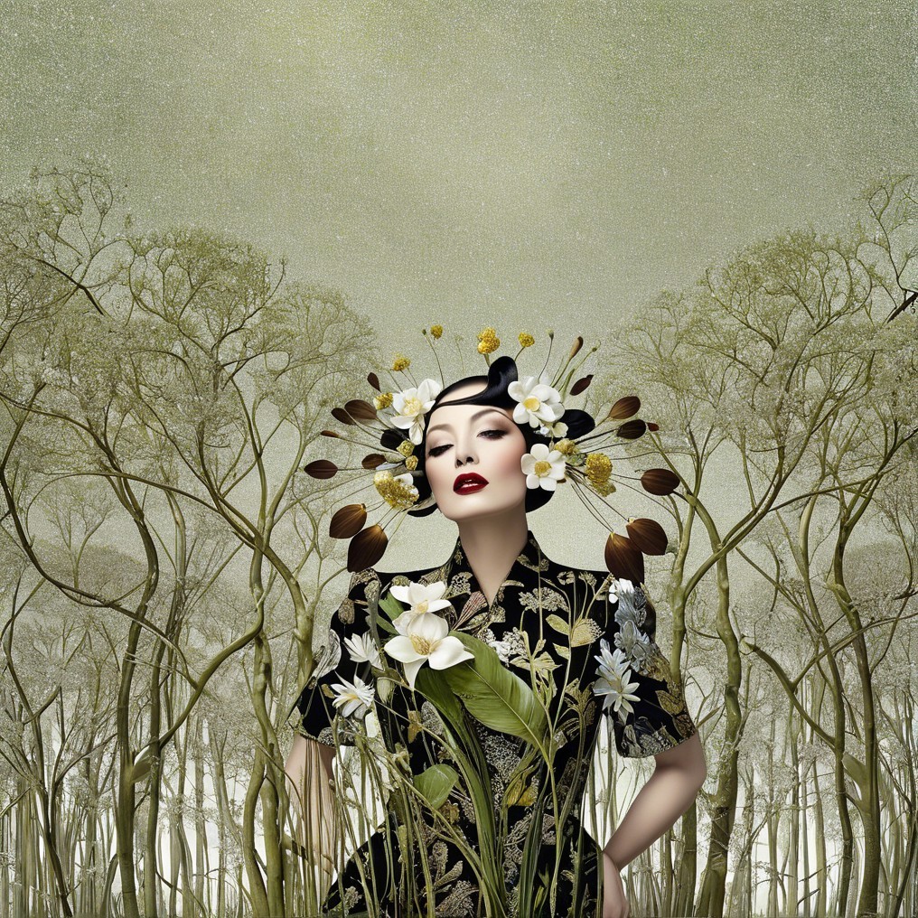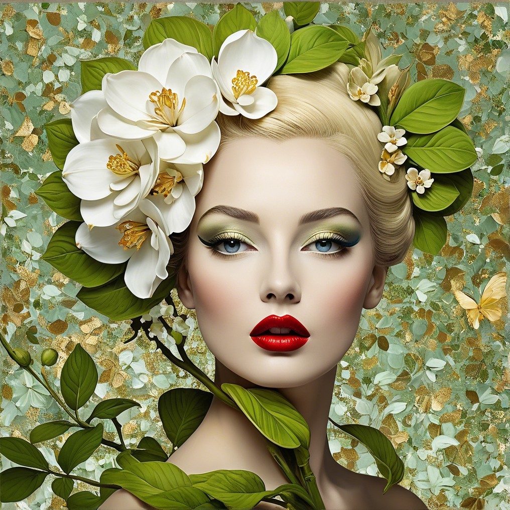 A stunning woman with vibrant green eyeshadow and bold red lips is framed by lush leaves and a large white flower in her elaborate, braided hairstyle, creating a captivating, nature-inspired look.