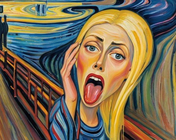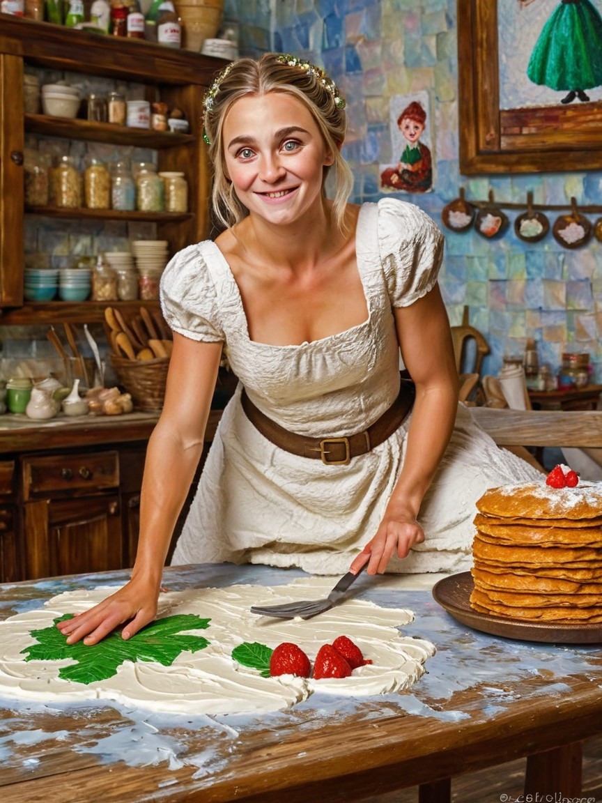 A young woman in a peasant dress and a floral halo is smiling and looking at the viewer while standing in a kitchen, decorating a white cream with a green cookie cut in the shape of a clover, 3 strawberries with green leaves, and a large spatula, on a large wooden table with a stack