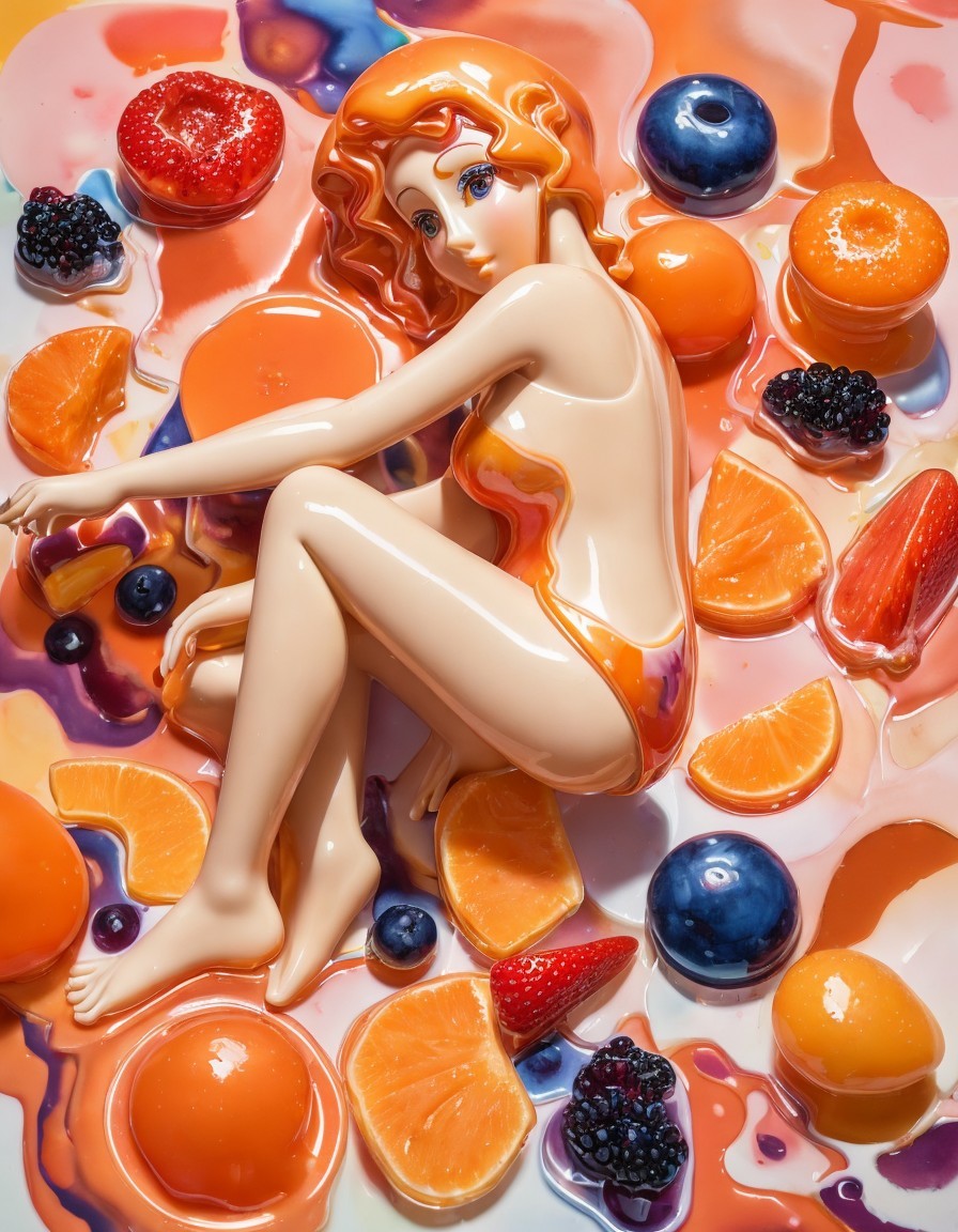 An artwork featuring a porcelain-like figure surrounded by colorful, realistic-looking fruits such as berries and oranges.
