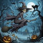 A whimsical cartoon witch in a big black hat stands against a full moon backdrop. She wields a broom and is surrounded by Halloween decorations like pumpkins and spooky trees.