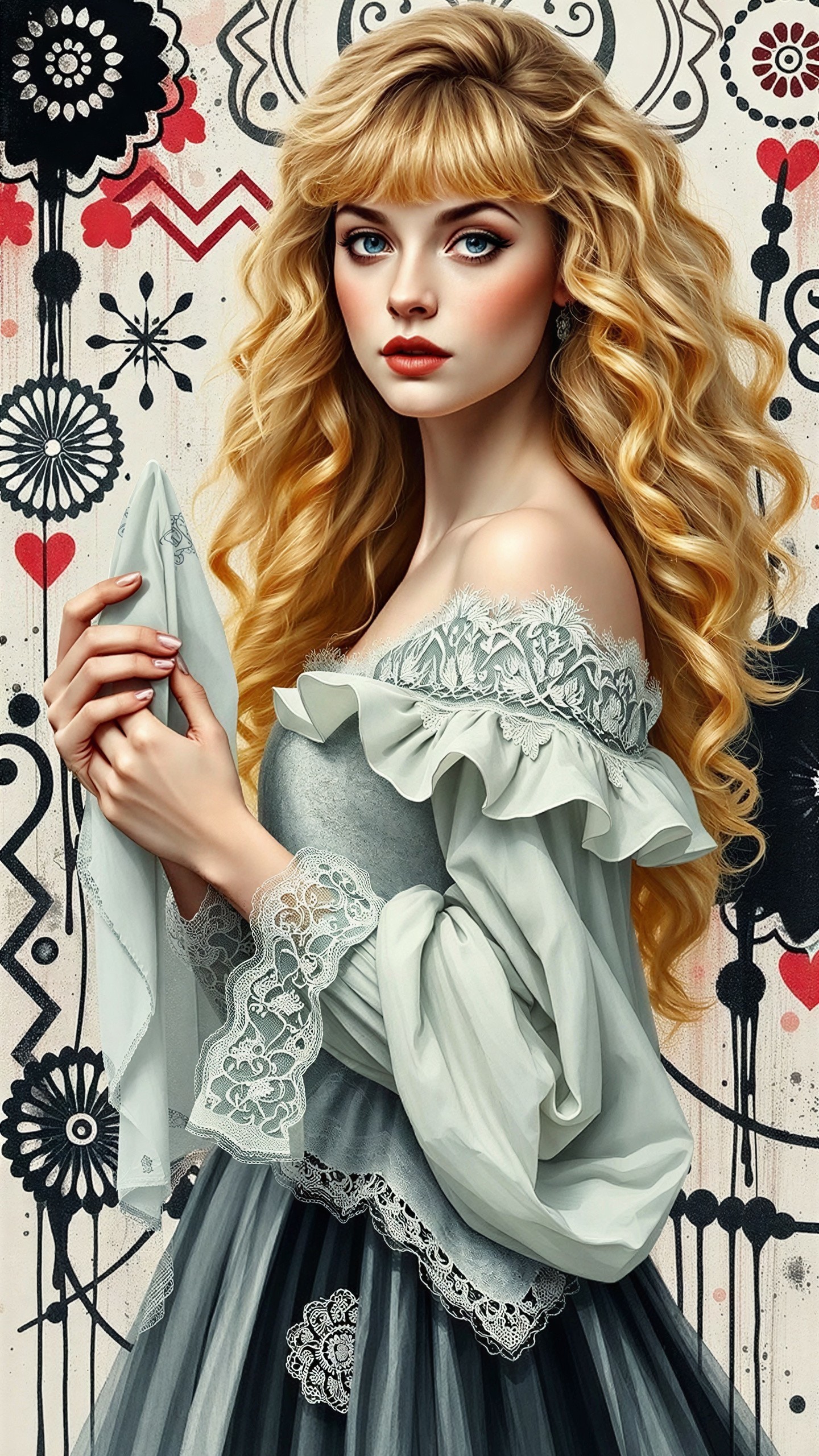 A vibrant splash paint image showcases a young woman with wild curly blonde hair, elegantly posed in a flowing gown against a dynamic abstract background. Her delicate features and bold pastel colors create a stunning visual.