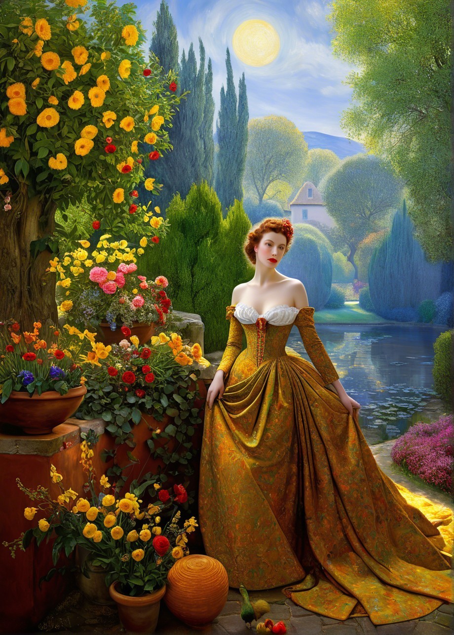 A young woman in a golden, elegant dress sits with flowers arranged beautifully in large pots. In the background there is mountain scenery, a waterfall, and a bright sun.