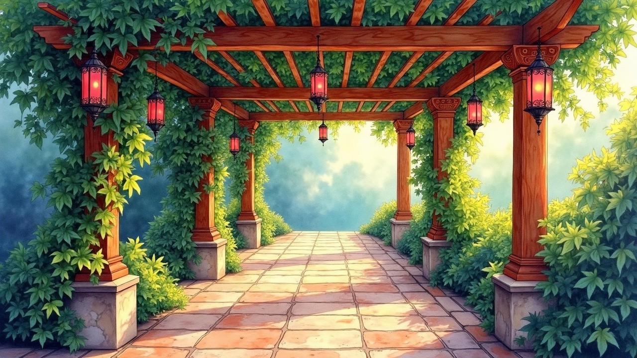 A serene garden path is framed by a wooden pergola, draped in lush green ivy. Soft light filters through, illuminating the stone walkway and creating a tranquil, enchanting atmosphere.