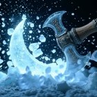 A beautifully crafted axe, glowing with ethereal light, rests among delicate white flowers. Sparkling particles surround it, creating a magical and enchanting atmosphere.