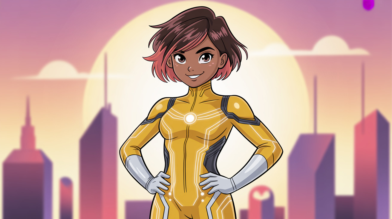 A charming superheroine with a sun-kissed tan showcases her vibrant personality and strength. Dressed in a colorful outfit, she embodies positivity and courage, ready to protect her city with a smile.