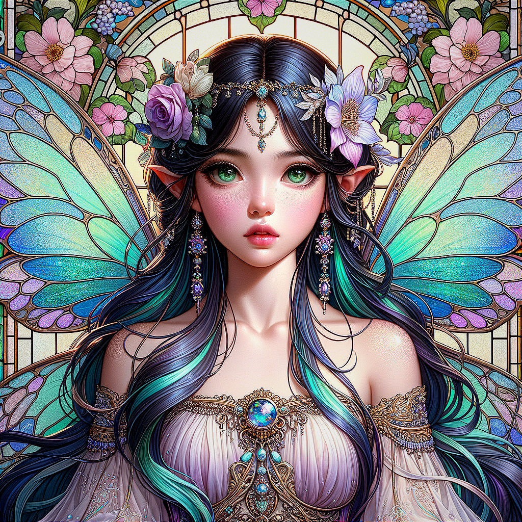 A fantastical elf with delicate features, adorned with a floral crown and intricate jewelry, against a stained-glass backdrop.