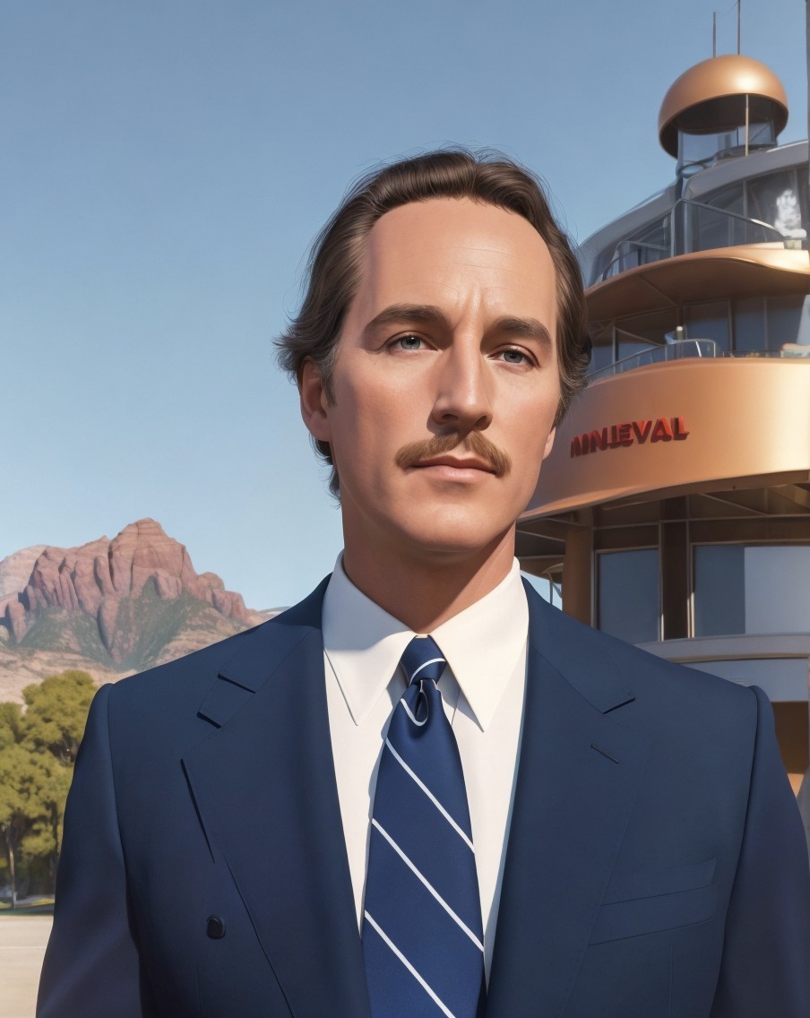 A digital artwork of a man in a suit with a stylized background featuring a building and mountains.
