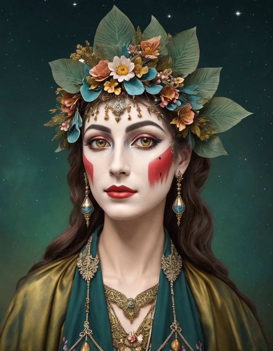 An illustrated woman with blue eyes, starry adornments, and celestial motifs set against a night sky backdrop.