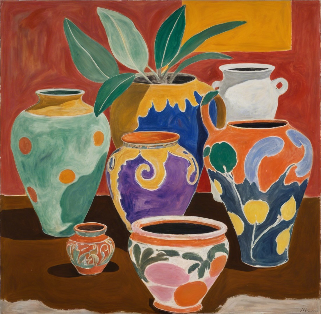 The image features a vibrant composition of various ceramic vases in different shapes and colors, arranged on a table with a backdrop of bold, contrasting colors and a leafy plant.