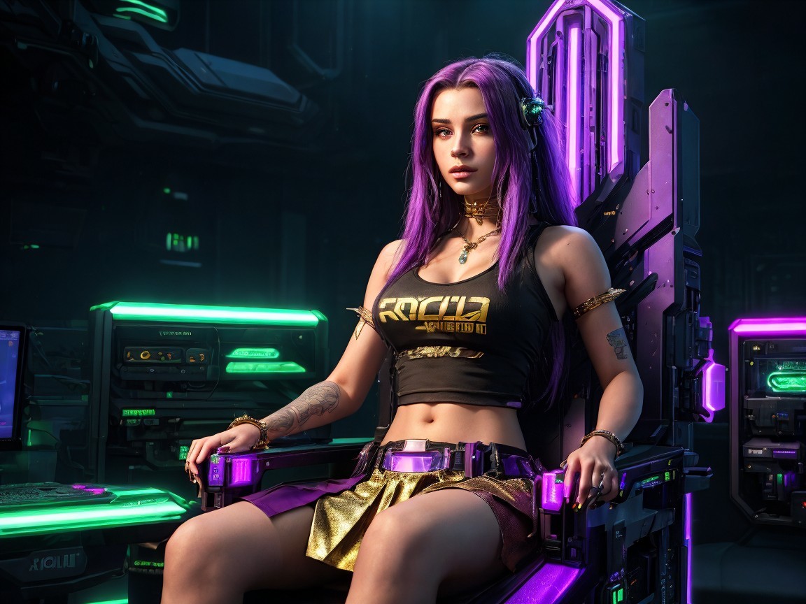 A striking cyberpunk character sits confidently in a futuristic chair, illuminated by vibrant neon lights. She has purple hair, wears a stylish outfit, and exudes a bold, dynamic energy.