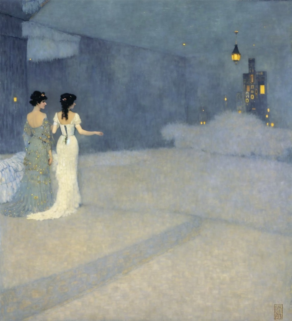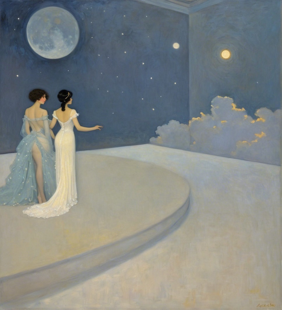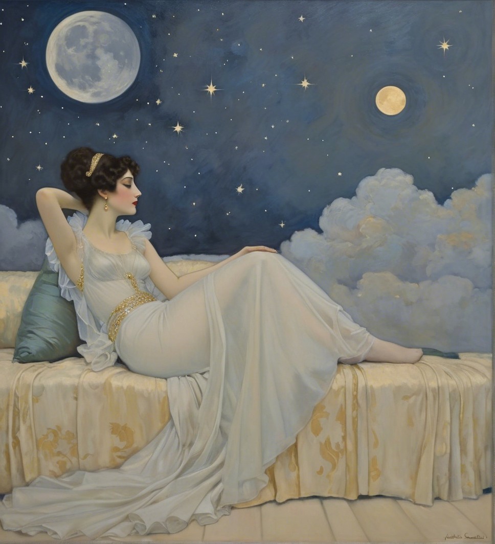 A glamorous figure lounges elegantly in a shimmering white gown against a starry night backdrop. The moon casts a gentle glow, highlighting her serene pose and delicate features.