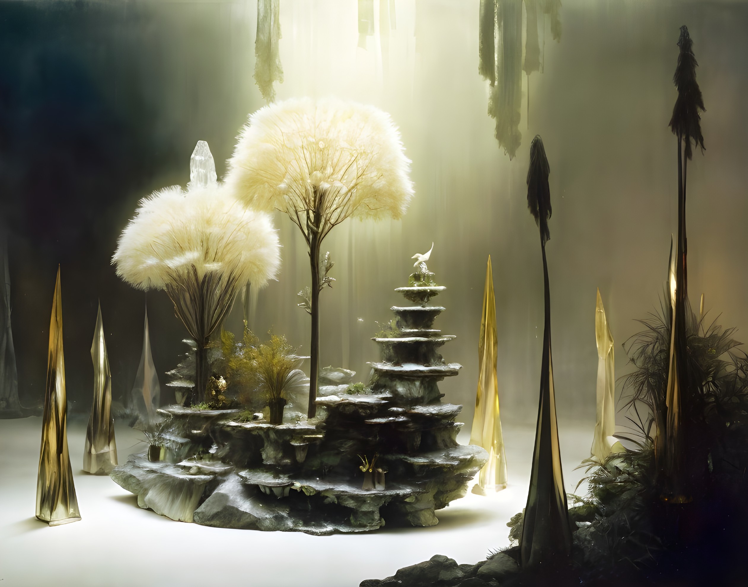 A mystical miniature landscape with fluffy trees, a crystal tower, and a layered rocky terrain, all bathed in a soft, ethereal light.