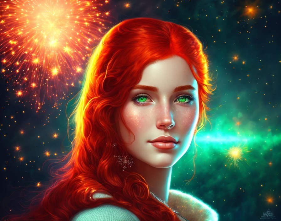 Vibrant digital portrait of a woman with red hair and green eyes amid fireworks.
