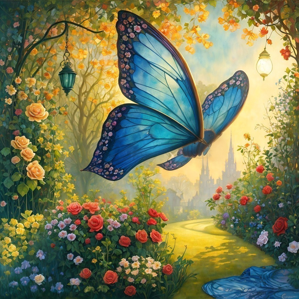 A vibrant painting of a blue butterfly among roses with a scenic castle in the background.