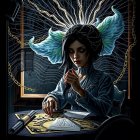 A young girl sits at a table with a Ouija board, focused and serene. Ghostly figures loom in the background, suggesting a connection to the spirit world. The atmosphere is eerie and mystical.